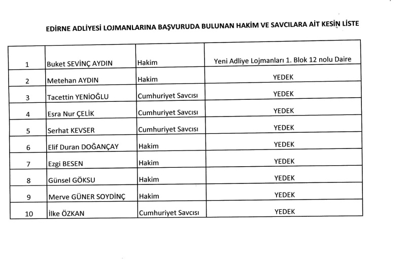 Edirne Adliyesi Lojmanlarına Başvuruda Bulunan Hâkim ve Savcılara Ait Kesin Liste